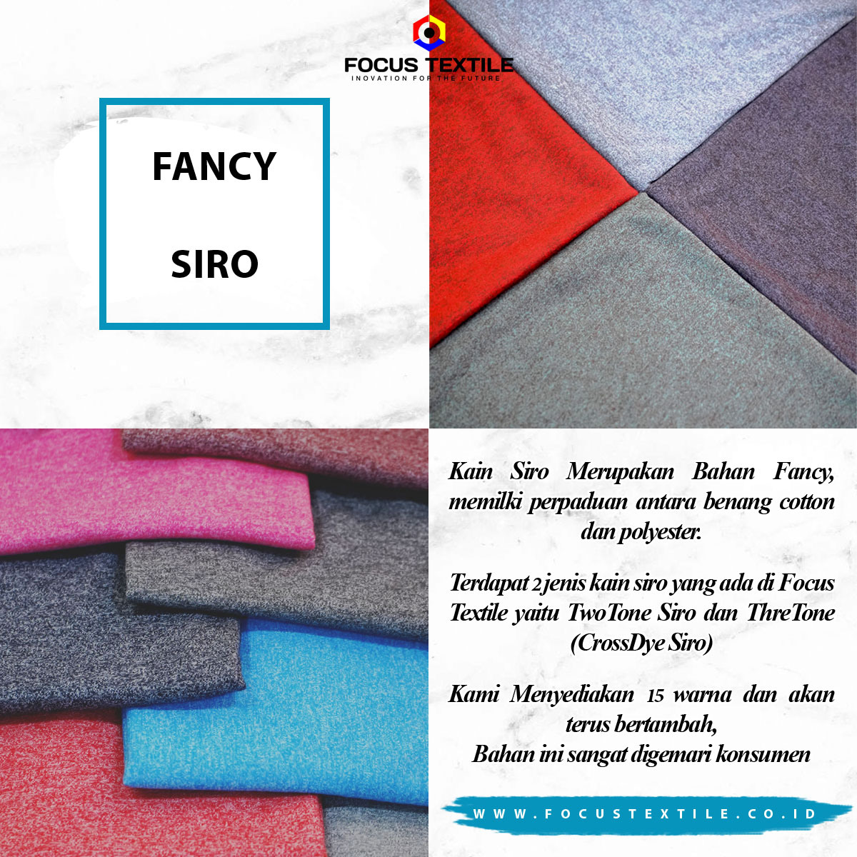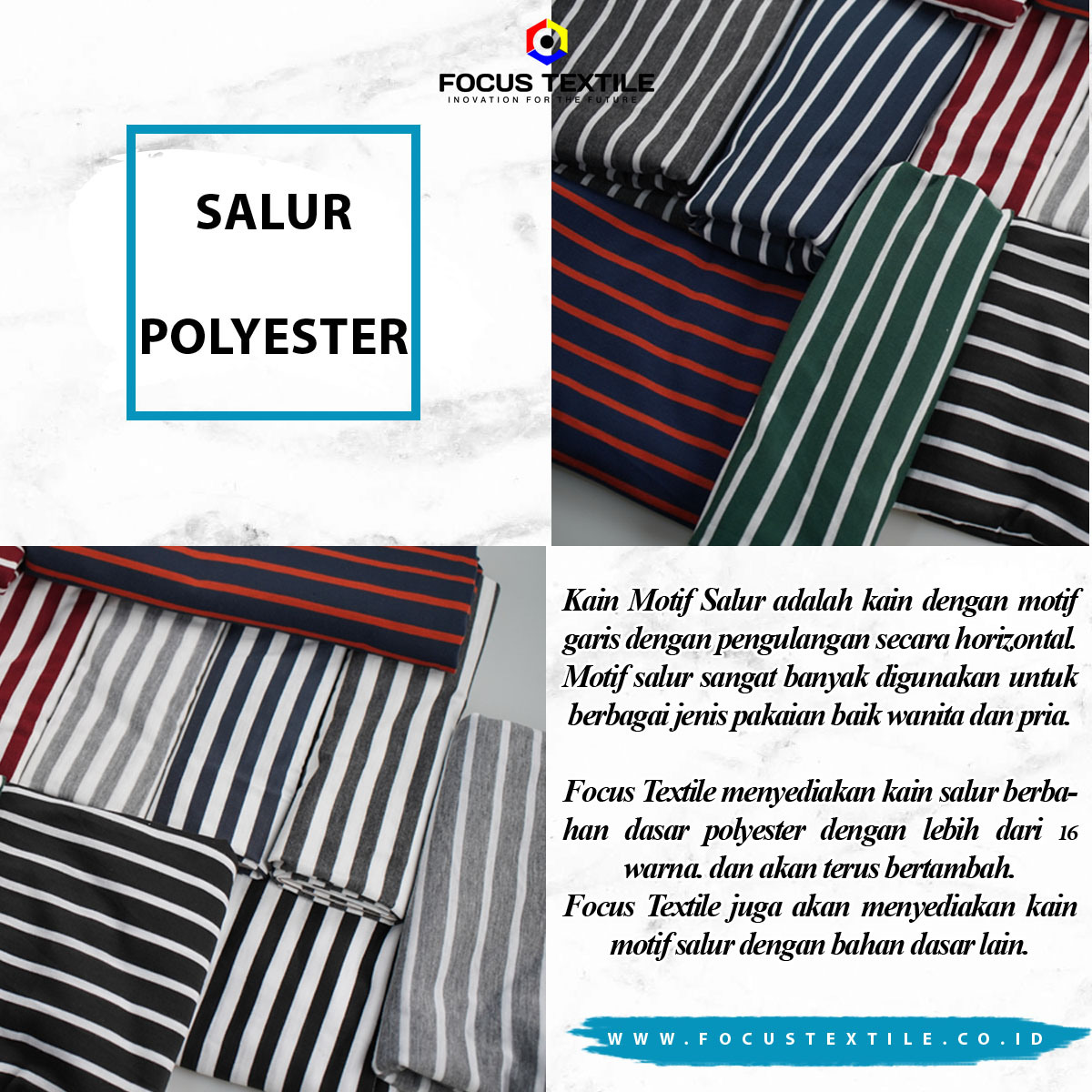 FOCUS TEXTILE MENYEDIAKAN KAIN SALUR BERBAGAI WARNA DAN CORAK DENGAN BAHAN DASAR POLYESTER. DENGAN HARGA YANG TERJANGKAU KAIN SALUR POLYESTER MENJADI SALAH SATU PILIHAN UNTUK ANDA YANG MENCARI BAHAN SALUR.